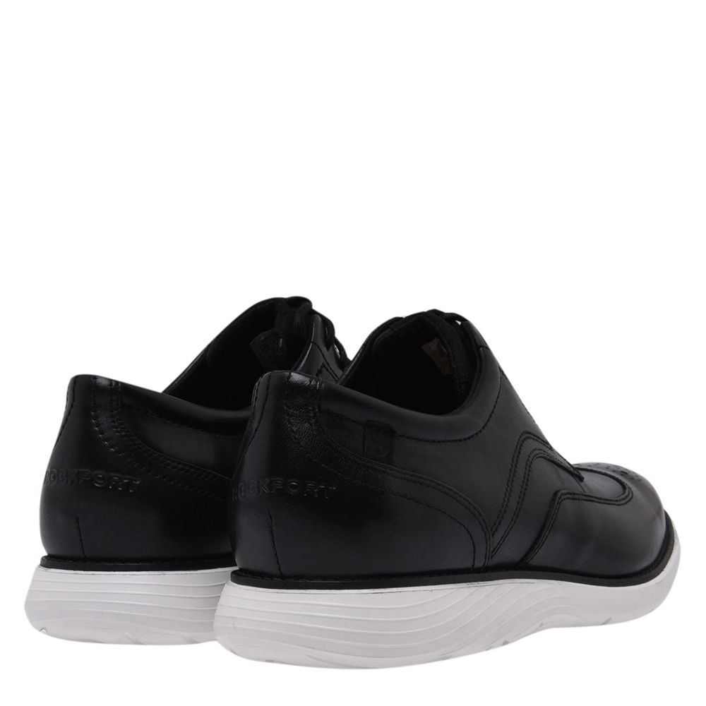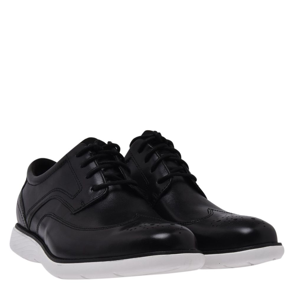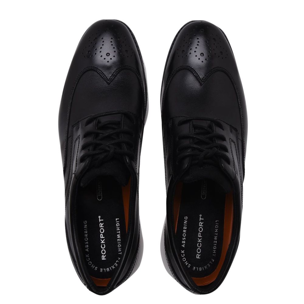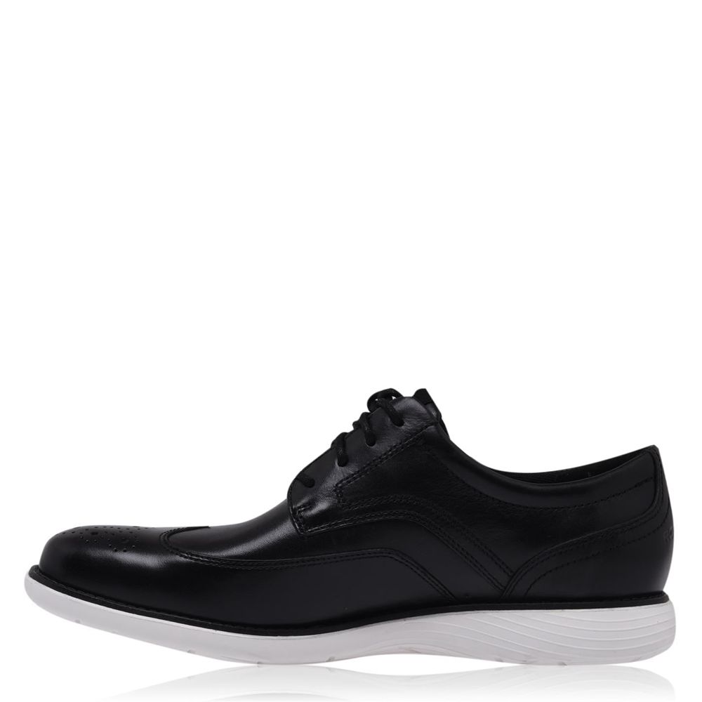 Rockport Garett Shoes Mens Redefine your shoe selection with the Garett Men's Shoes from Rockport. These mixed shoes feature a leather upper with lace closure and a smart feel. The sole contrasts with a bold foam along the bottom for a cushioned ride with embossed Rockport branding to the rear. Upper: Leather / Textile Lining: Textile Outsole: Synthetic