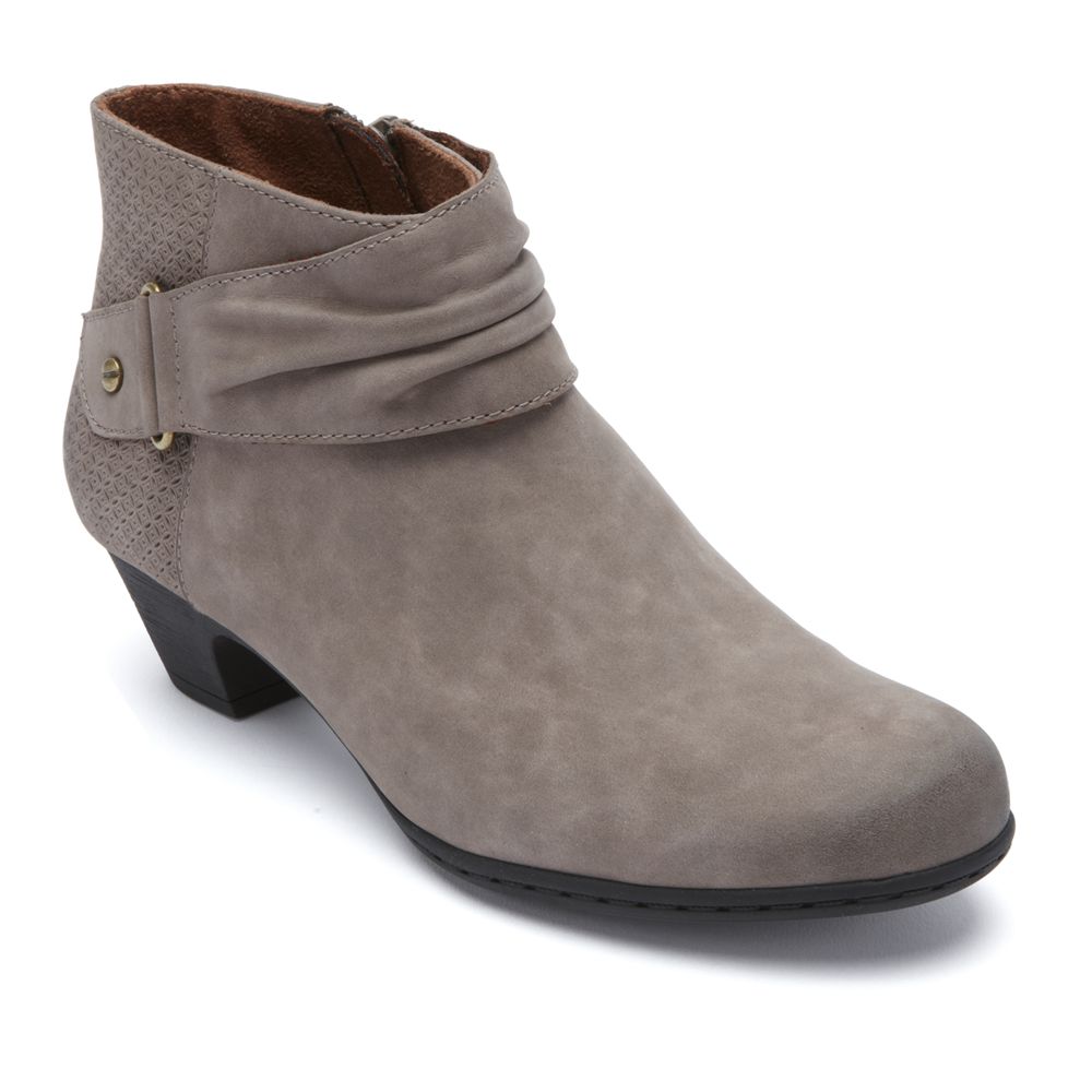 - Ruched details and laser-cut accents add charm to these ankle boots