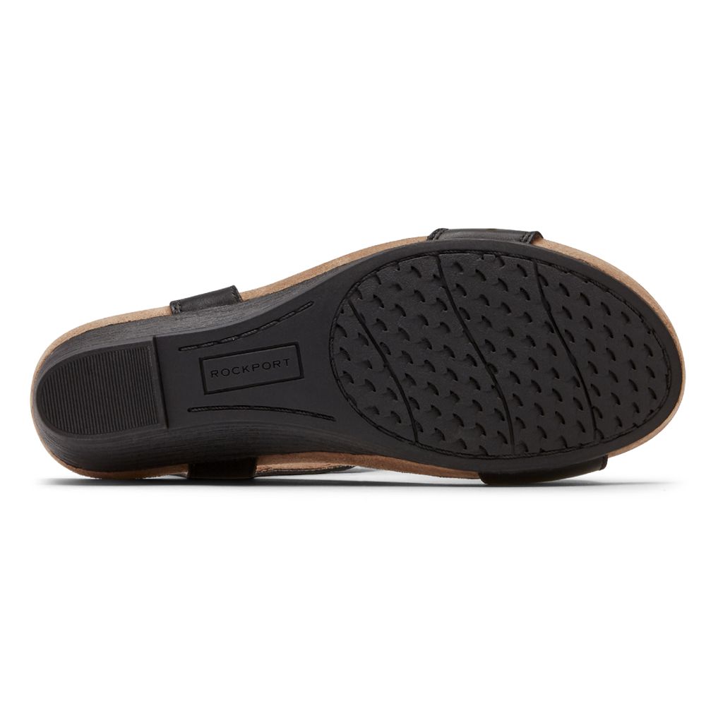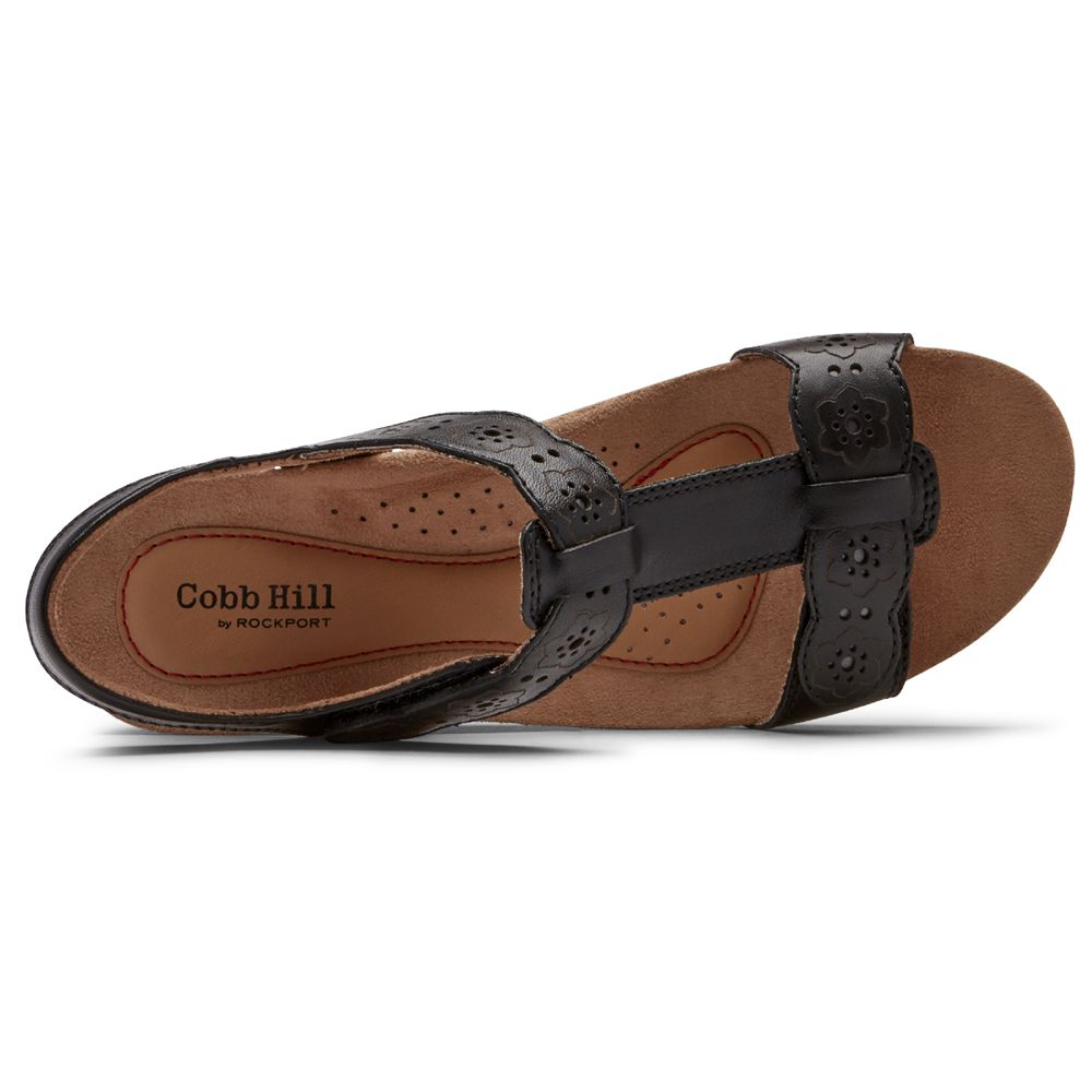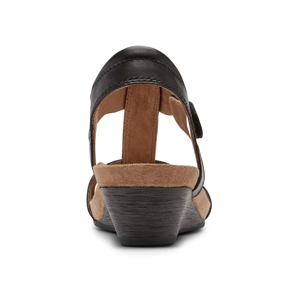 Rockport Women's Cobb Hill Hollywood T-Strap Wedges Sandals - Black - USA (3802ZEKQM)